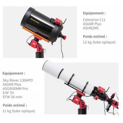 Compatible avec le boîtier ASIAIR Plus, la monture AM5N s'intègre parfaitement dans une configuration astrophotographique complète, basée sur les caméras, roues à filtres ou moteurs de mise au point de marque ZWO.