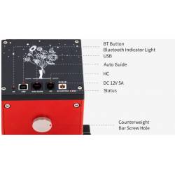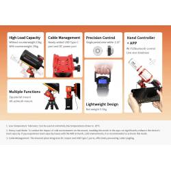 La monture ZWO AM5N est équipée d'une motorisation double-axe qui assure le suivi sidéral, les déplacements GOTO ou manuels, ainsi que l'autoguidage. Vous trouverez fournie avec, une raquette de commande à joystick qui dispose du pointage automatique, réalisé via l'application sur Smartphone ou par l'intermédiaire de programmes tiers via un pilote ASCOM. La monture est pilotable aussi bien par une connexion Wi-Fi intégrée, gérée par une interface web, que par une connexion filaire. La mise à jour des firmwares de la raquette de commande et de la monture est très simple et facile à mettre en œuvre.