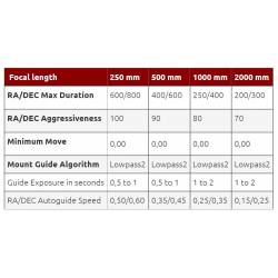 Pour cela, un port d'autoguidage compatible ST-4 équipe le panneau de contrôle de la monture ; vous pourrez ainsi relier une caméra d'autoguidage à votre monture et obtenir un suivi parfait. La dernière photo donne une indication des paramètres à rentrer dans le logiciel de guidage PHD2, en fonction de la focale de votre instrument.