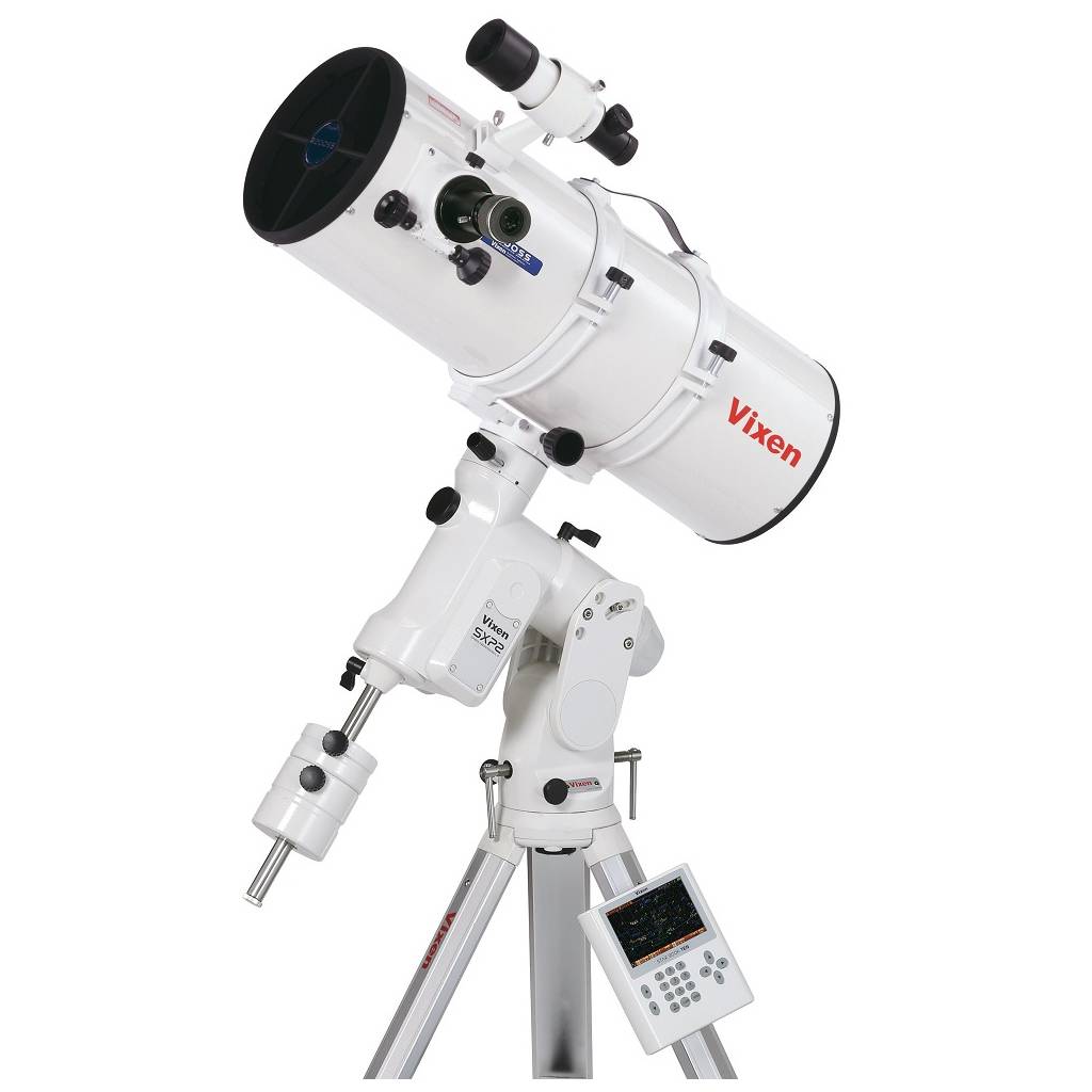 Télescope Vixen sur monture équatoriale SXP2 Goto. Diamètre 200 mm, focale 800 mm (F/D=4). Livré avec 2 oculaires 20 mm et 5 mm, chercheur 7x50, trépied SXG-HAL130.