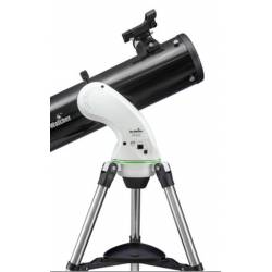 Pour réaliser l'alignement de la monture azimutale automatique, le télescope est muni d'un chercheur point rouge. Son principe ne dispose d'aucun dispositif de grossissement et s'avère très simple d'utilisation : il suffit d'aligner le point rouge lumineux du chercheur avec l'étoile ou la planète de votre choix, pour que cette dernière se retrouve également au centre de l'oculaire du télescope. Notre conseil, gardez les 2 yeux ouverts lors du pointage : l'un voit le réticule, l'autre voit l'ensemble de champ étoilé vers lequel diriger le télescope.