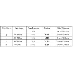 Le jeu de filtres photométriques Sloan d'Antlia comprend quatre filtres couvrant la gamme de 400 nm jusqu'à la limite de sensibilité des caméras CCD au silicium, aux alentours de 1 100 nm. En achetant cet article, vous achetez uniquement le filtre Sloan Antlia i'.