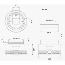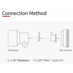 L'ASI585MM possède un filetage d'entrée de type M42 femelle, mais un convertisseur mécanique M42 vers le coulant 31,75 mm mâle est livré avec la caméra, pour l'adapter dans les porte-oculaires standards des télescopes et lunettes du marché. Le corps de la caméra est également doté d'un coulant 50,8 mm (2") mâle.