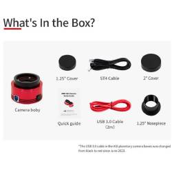 Un cordon USB 3.0 de 2m de longueur et un cordon d'autoguidage au protocole ST4 (2m aussi) font également partie du lot.
