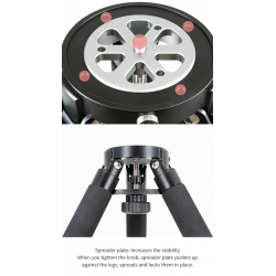 Le trépied carbone TC-40 est léger et stable. De plus, il est équipé d'une partie "sac, en tissu" située entre les 3 jambes du trépied pour déposer vos oculaires et autres accessoires. Notre conseil en astrophotographie, vous pouvez lester le trépied et descendre le centre gravité de toute votre instrumentation, en plaçant une charge lourde sur le sac en tissus, comme un contrepoids par exemple.
